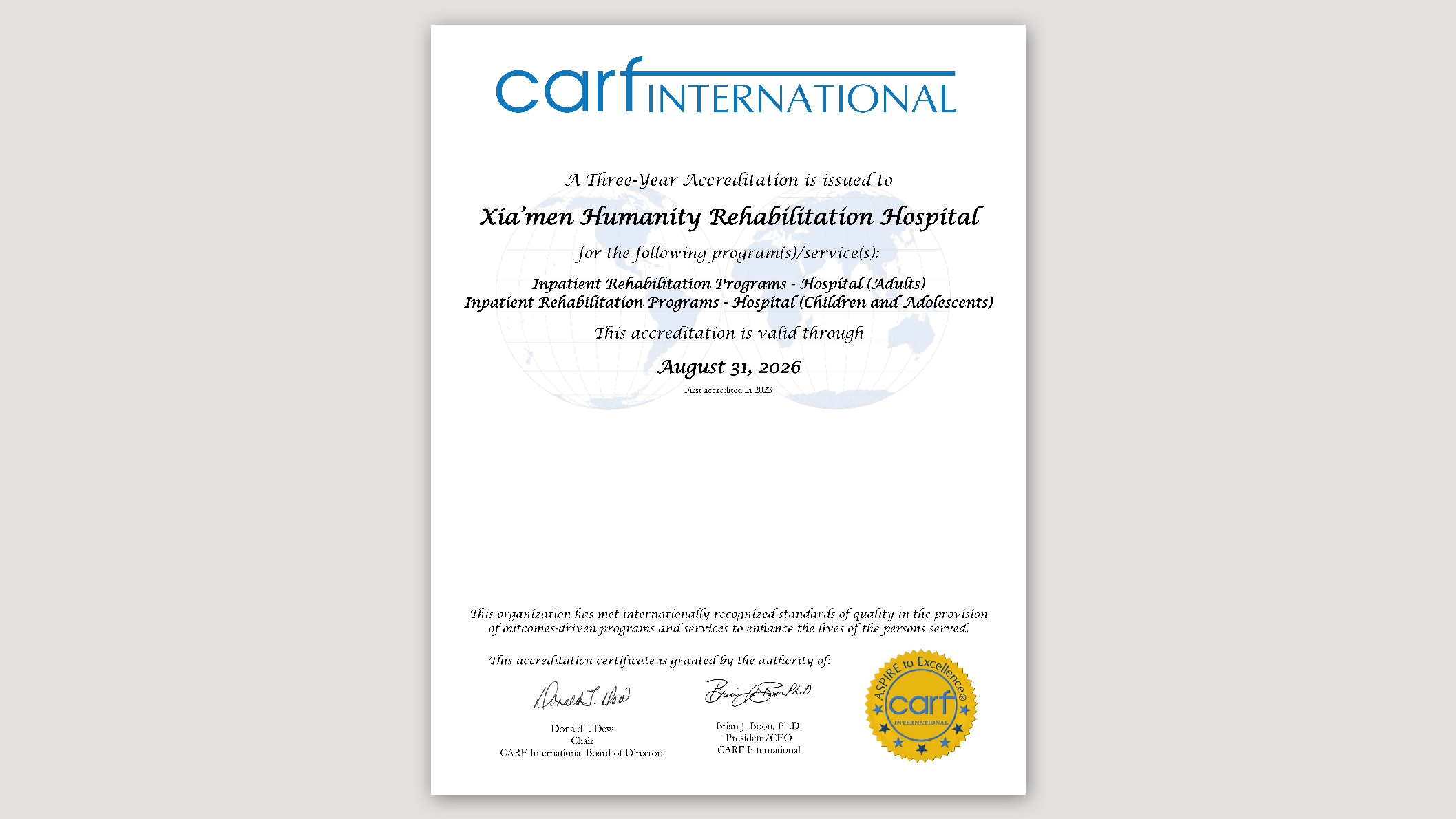 廈門弘愛康復(fù)醫(yī)院獲得CARF綜合住院項(xiàng)目三年期國際康復(fù)認(rèn)證