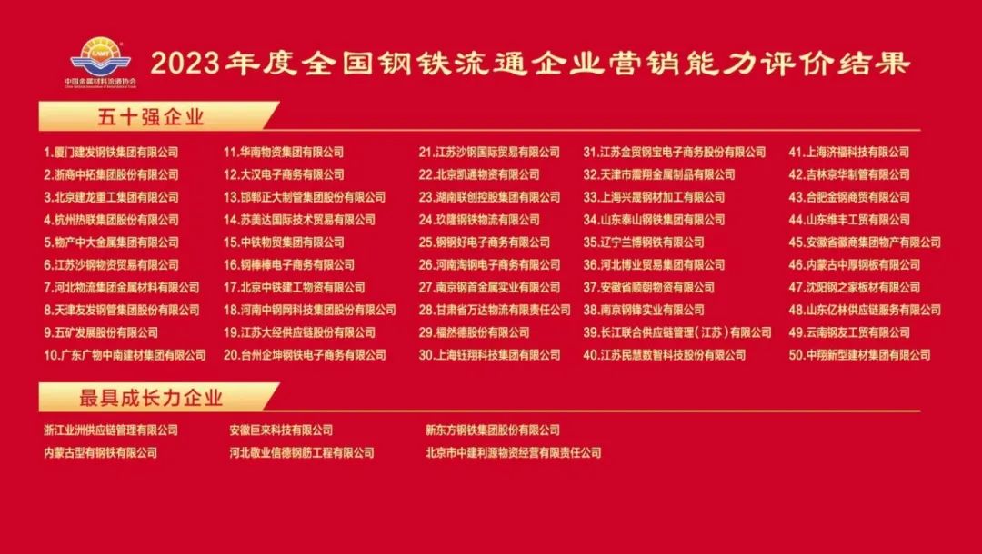 10月30日,第十九屆中國鋼鐵流通促進(jìn)大會上發(fā)布了2023年度全國鋼鐵流通企業(yè)營銷能力評價結(jié)果(五十強(qiáng)企業(yè)),建發(fā)鋼鐵集團(tuán)位列年度營銷能力及鋼材銷售業(yè)績行業(yè)第一名。