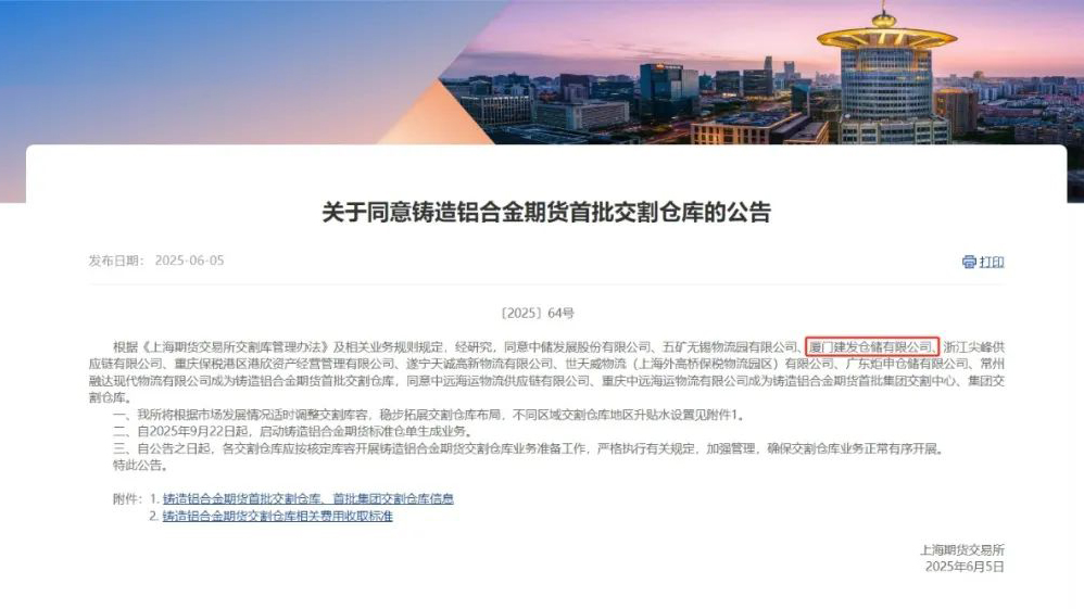 日前,上海期貨交易所公布鑄造鋁合金期貨指定交割倉庫名單,建發(fā)倉儲寧波鎮(zhèn)海庫及嘉興海鹽庫雙雙獲批,成為首批鑄造鋁合金期貨交割倉庫,這是建發(fā)倉儲首次取得有色金屬品種的期貨交割庫資質(zhì)。